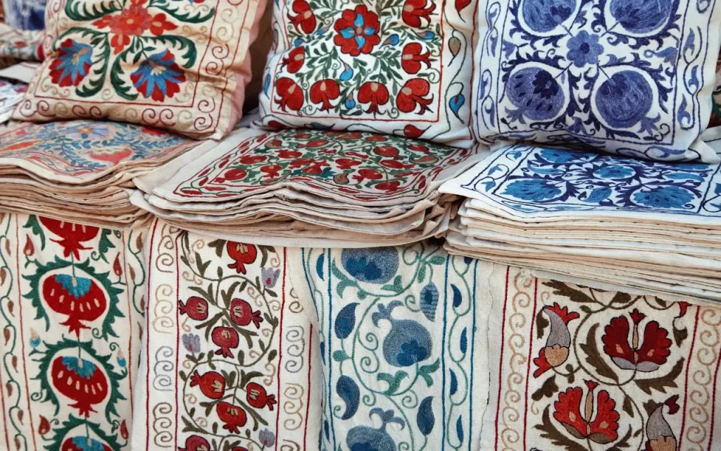The best Uzbek textile souvenirs to take home are Ikat, Suzani, papers, table runners, and rugs.